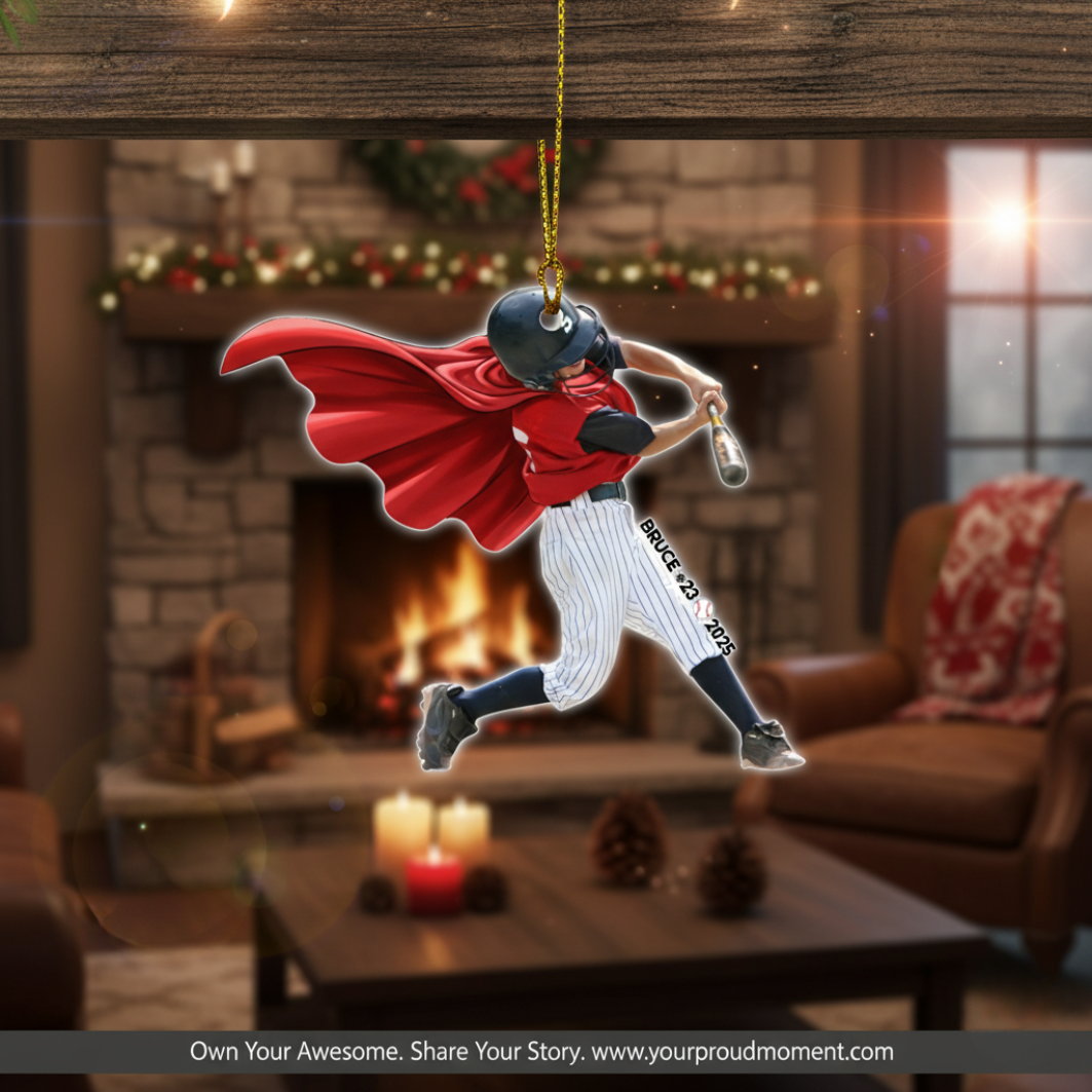 Personalized Sport Photo ornament made from 100% Acrylic material, featuring custom kids Christmas designs for baseball and football lovers. Perfect for sports enthusiasts and team players. Relevant for Christmas, birthdays, and sports team celebrations.