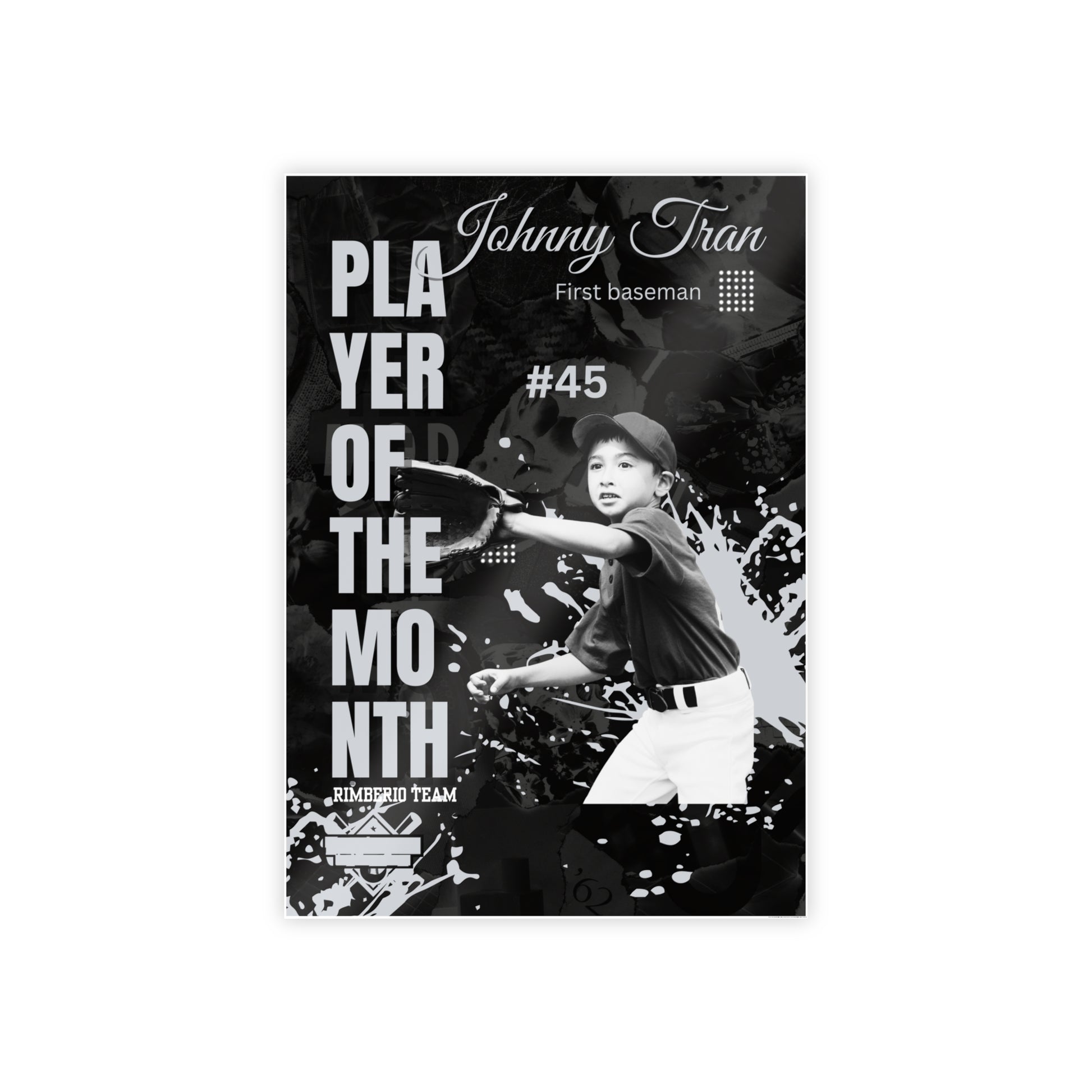 Personalized MVP Player of the Month Baseball Posters with a high-gloss finish, vibrant prints, and four sizes to choose from. Perfect for baseball fans looking to celebrate their favorite player or commemorate a special achievement. Ideal for birthdays, sports events, and Father's Day.